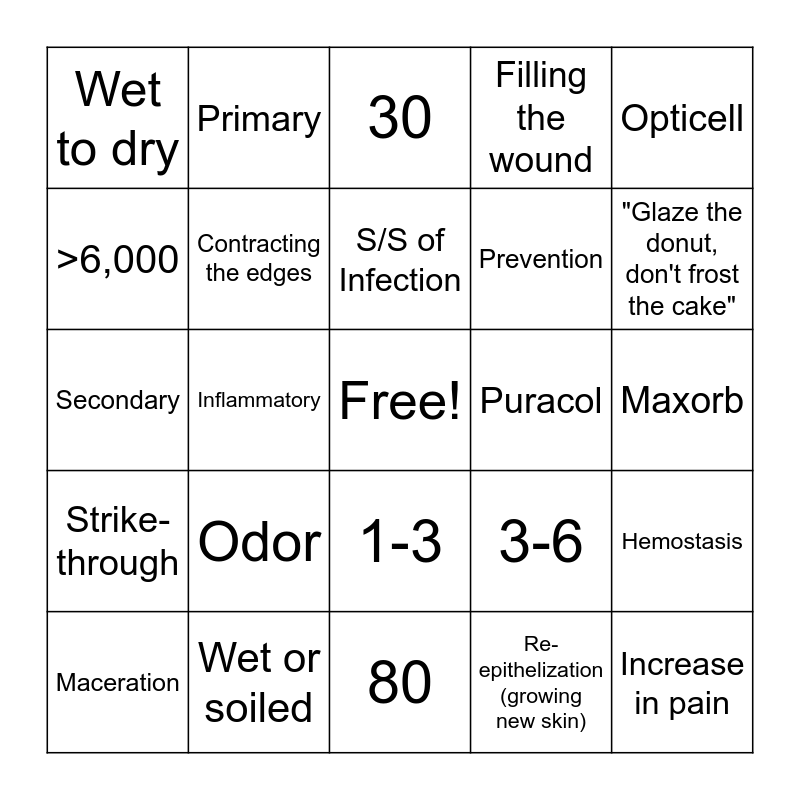 This bingo card has a free space and 24 words: Odor, Wet or soiled, S/S of Infection, Maceration, Opticell, Wet to dry, >6,000, Primary, Puracol, 1-3, Prevention, Secondary, 3-6, Hemostasis, Contracting the edges, Re-epithelization (growing new skin), Maxorb, 30, "Glaze the donut, don't frost the cake", Inflammatory, Increase in pain, Strike-through, Filling the wound and 80.
