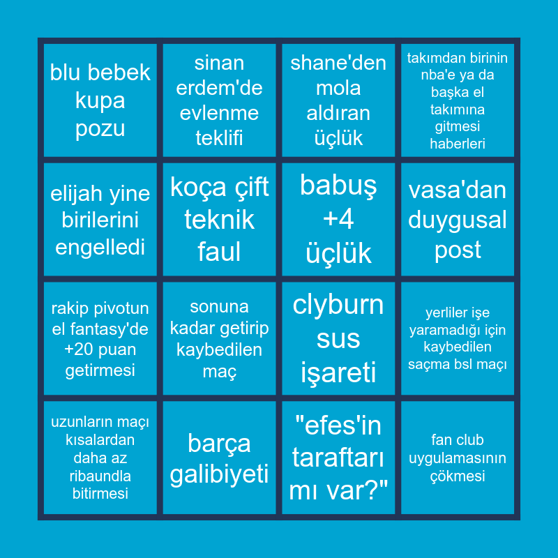This bingo card has 16 words: barça galibiyeti, yerliler işe yaramadığı için kaybedilen saçma bsl maçı, shane'den mola aldıran üçlük, blu bebek kupa pozu, rakip pivotun el fantasy'de +20 puan getirmesi, sinan erdem'de evlenme teklifi, clyburn sus işareti, "efes'in taraftarı mı var?", elijah yine birilerini engelledi, koça çift teknik faul, uzunların maçı kısalardan daha az ribaundla bitirmesi, takımdan birinin nba'e ya da başka el takımına gitmesi haberleri, sonuna kadar getirip kaybedilen maç, vasa'dan duygusal post, babuş +4 üçlük and fan club uygulamasının çökmesi.