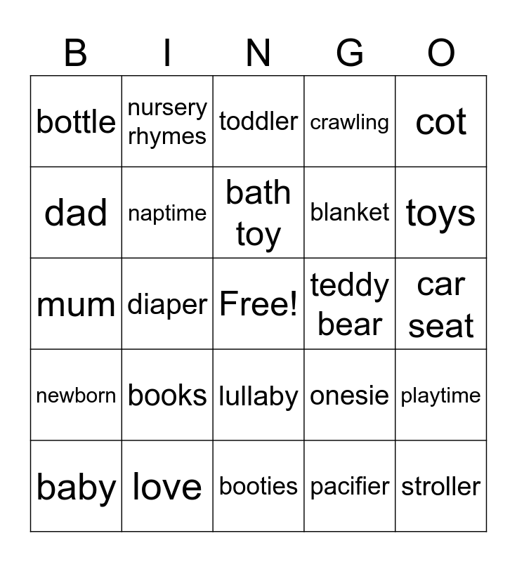 This bingo card has a free space and 29 words: baby, rattle, diaper, milk, bottle, toddler, naptime, books, teddy bear, love, car seat, stroller, booties, pacifier, toys, bib, lullaby, newborn, cot, mum, onesie, formula, blanket, dad, crawling, nursery rhymes, playtime, bath toy and crying.