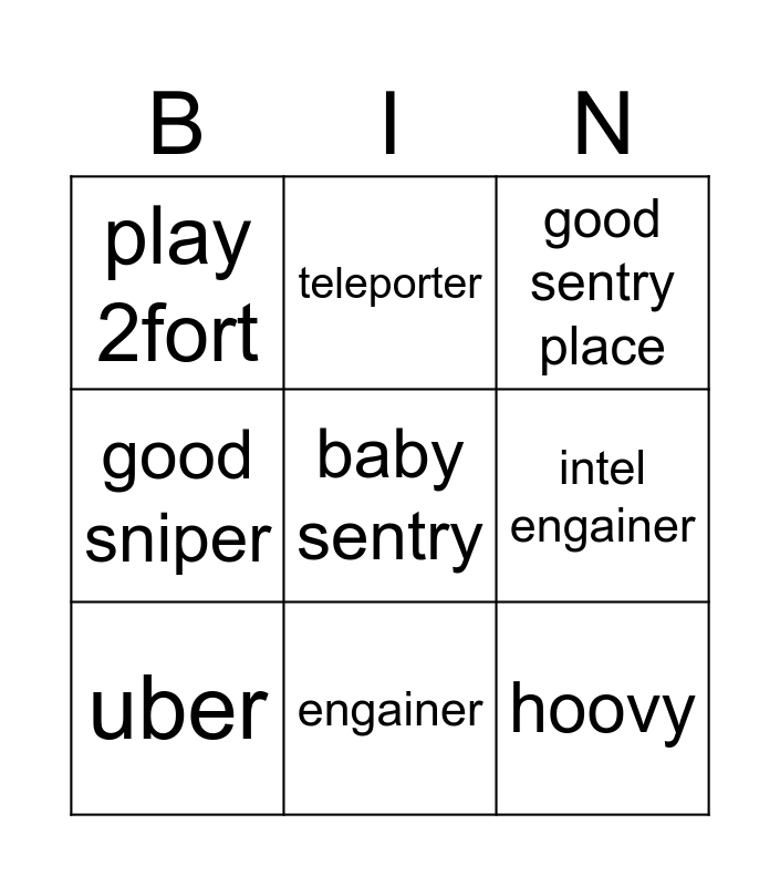 This bingo card has 9 words: uber, good sentry place, teleporter, good sniper, play 2fort, intel engainer, baby sentry, hoovy and engainer.