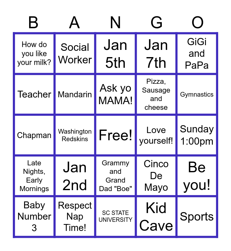 This bingo card has a free space and 24 words: Jan 2nd, Respect Nap Time!, Ask yo MAMA!, Baby Number 3, GiGi and PaPa, How do you like your milk?, Teacher, Social Worker, Love yourself!, Grammy and Grand Dad "Boe", Pizza, Sausage and cheese, Chapman, Cinco De Mayo, Be you!, Mandarin, Kid Cave, Sunday 1:00pm, Jan 5th, Gymnastics, Washington Redskins, Sports, Late Nights, Early Mornings, Jan 7th and SC STATE UNIVERSITY.