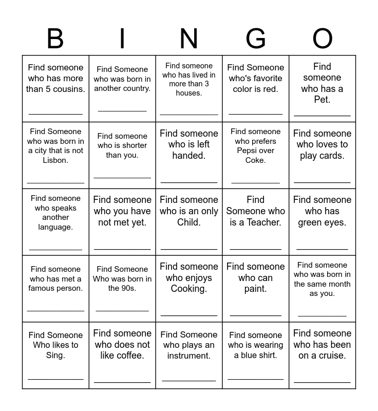 This bingo card has 25 words: Find Someone Who was born in the 90s. ____________, Find Someone who plays an instrument. ___________, Find someone who is left handed. ___________, Find Someone Who likes to Sing. ____________, Find someone who has a Pet. ___________, Find someone who has more than 5 cousins. ___________, Find Someone who was born in a city that is not Lisbon. _____________, Find Someone who was born in another country. ___________, Find Someone who is a Teacher. __________, Find someone who enjoys Cooking. ___________, Find someone who prefers Pepsi over Coke. ___________, Find someone who speaks another language. ____________, Find someone who can paint. __________, Find someone who was born in the same month as you. ___________, Find someone who is shorter than you. _____________, Find someone who has been on a cruise. ___________, Find someone who has green eyes. __________, Find someone who has lived in more than 3 houses. ______________, Find someone who loves to play cards. ___________, Find someone who you have not met yet. ___________, Find someone who is an only Child. ___________, Find someone who does not like coffee. ___________, Find someone who has met a famous person. _____________, Find Someone who's favorite color is red. ___________ and Find someone who is wearing a blue shirt. ____________.