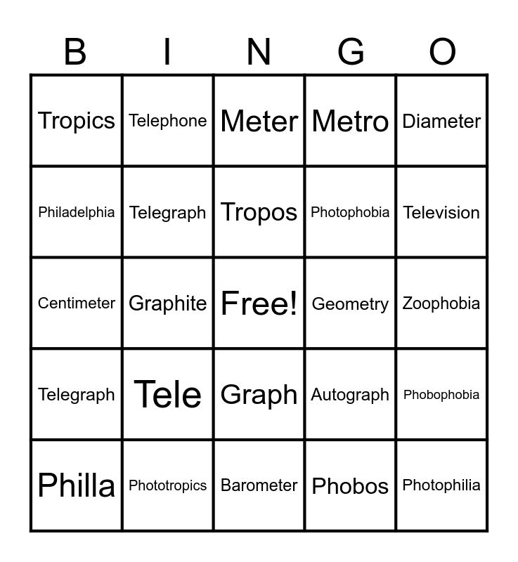 This bingo card has a free space and 24 words: Philla, Tele, Tropos, Phobos, Diameter, Tropics, Telephone, Meter, Geometry, Zoophobia, Centimeter, Telegraph, Autograph, Phobophobia, Philadelphia, Phototropics, Barometer, Metro, Television, Telegraph, Graphite, Graph, Photophobia and Photophilia.