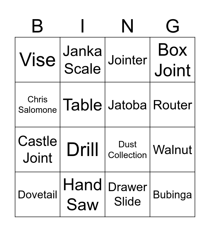 This bingo card has 33 words: Free!, Ceramic Coating, Walnut, Mahogany, Bubinga, Jatoba, Chris Salomone, Ash, Janka Scale, Table Saw, Router, Jointer, Planer, Band Saw, Hand Saw, Drill, Impact Driver, Dust Collection, Bourbon Moth, Blacktail Studio, Moisture, Hand Plane, Vise, Drawer Slide, Basswood, Dovetail, Box Joint, Castle Joint, Table, Chair, Door, Mark Spagnolo and Matt Cremona.