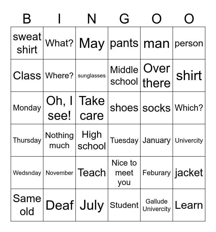 This bingo card has 64 words: Free!, Nice to meet you, What's up?, Nothing much, Same old, Who?, What?, When?, Where?, Why?, Which?, So-so, Take care, man, woman, person, shirt, sweat shirt, eyeglsses, sunglasses, socks, shoes, pants, jacket, Teacher, Student, Deaf, Hearing, Teach, Learn, English, French, Language, Elementary school, Middle school, High school, College, Univercity, Gallude Univercity, Class, Over there, Oh, I see!, Sign, Speak, Still Speak, Monday, Tuesday, Wedsnday, Thursday, Friday, Satuarday, Sunday, January, Feburary, March, April, May, June, July, August, September, October, November and December.