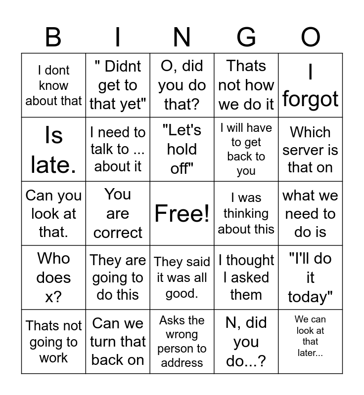 This bingo card has a free space and 24 words: They are going to do this, Can we turn that back on, "Let's hold off", Thats not going to work, I forgot, I dont know about that, Is late., " Didnt get to that yet", I was thinking about this, They said it was all good., I will have to get back to you, Can you look at that., I thought I asked them, "I'll do it today", I need to talk to ... about it, N, did you do...?, what we need to do is, O, did you do that?, Which server is that on, You are correct, We can look at that later..., Who does x?, Thats not how we do it and Asks the wrong person to address.