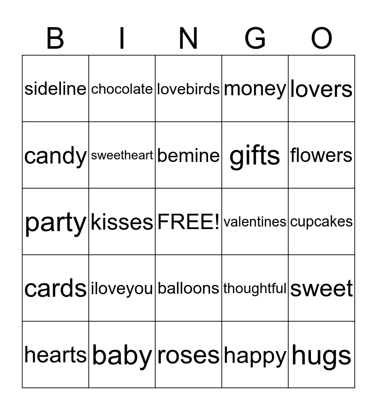 This bingo card has a free space and 24 words: iloveyou, baby, bemine, hearts, lovers, sideline, candy, chocolate, valentines, balloons, gifts, party, thoughtful, sweet, sweetheart, happy, cupcakes, lovebirds, flowers, kisses, hugs, cards, money and roses.