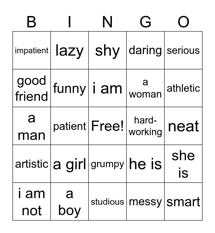 This bingo card has a free space and 24 words: a girl, a boy, i am, i am not, serious, impatient, good friend, lazy, hard-working, grumpy, a woman, a man, he is, she is, funny, messy, neat, shy, athletic, patient, smart, artistic, daring and studious.