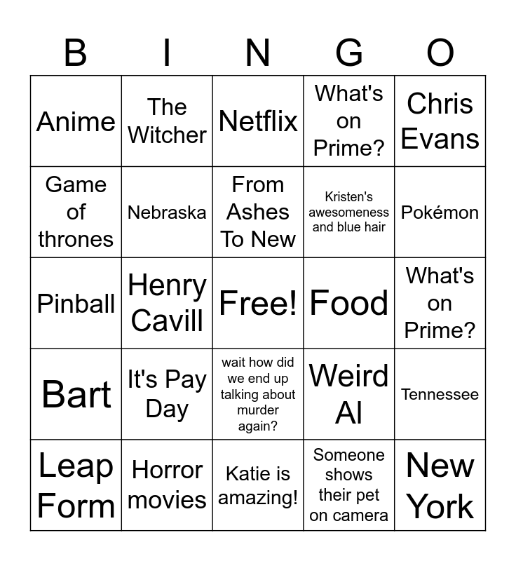 This bingo card has a free space and 24 words: It's Pay Day, Horror movies, From Ashes To New, Leap Form, Chris Evans, Anime, Game of thrones, The Witcher, Food, wait how did we end up talking about murder again?, Kristen's awesomeness and blue hair, Pinball, Weird Al, Tennessee, Nebraska, Someone shows their pet on camera, What's on Prime?, Netflix, Pokémon, Henry Cavill, New York, Bart, What's on Prime? and Katie is amazing!.