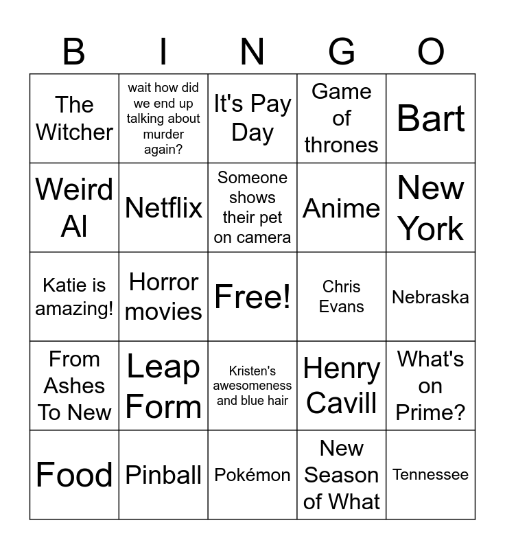 This bingo card has a free space and 24 words: Leap Form, Pinball, Someone shows their pet on camera, Food, Bart, The Witcher, Weird Al, wait how did we end up talking about murder again?, Chris Evans, Kristen's awesomeness and blue hair, Anime, Katie is amazing!, Henry Cavill, What's on Prime?, Netflix, New Season of What, Nebraska, It's Pay Day, New York, Horror movies, Tennessee, From Ashes To New, Game of thrones and Pokémon.