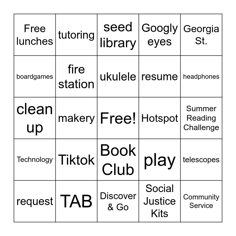 This bingo card has a free space and 29 words: request, apps, makery, library card, Free lunches, seed library, fire station, Tiktok, Hotspot, TAB, Summer Reading Challenge, Community Service, Discover & Go, Social Justice Kits, headphones, color printing, Book Club, Technology, Georgia St., clean up, play, videogames, resume, boardgames, Googly eyes, tutoring, telescopes, ukulele and newspapers.