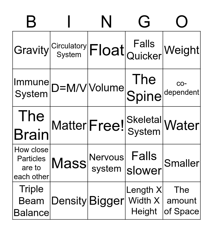 This bingo card has a free space and 24 words: Mass, Density, Volume, Triple Beam Balance, Weight, Gravity, Immune System, Circulatory System, Skeletal System, Nervous system, The Spine, The Brain, Falls slower, Smaller, D=M/V, Length X Width X Height, Water, Float, co-dependent, Matter, The amount of Space, How close Particles are to each other, Falls Quicker and Bigger.