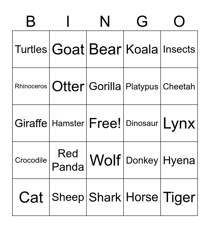 This bingo card has a free space and 43 words: Lion, Tiger, Dog, Cat, Bird, Horse, Bear, Snake, Insects, Sheep, Koala, Dinosaur, Wolf, Red Panda, Quokka, Shark, Sloths, Giraffe, Leopard, Cheetah, Goat, Deer, Capybara, Turtles, Narwahl, Lynx, Blobfish, Raccoon, Donkey, Crocodile, Hedgehog, Hyena, Spider, Hamster, Hippo, Meerkat, Squirrel, Gorilla, Rhinoceros, Platypus, Lizard, Otter and Amphibian.