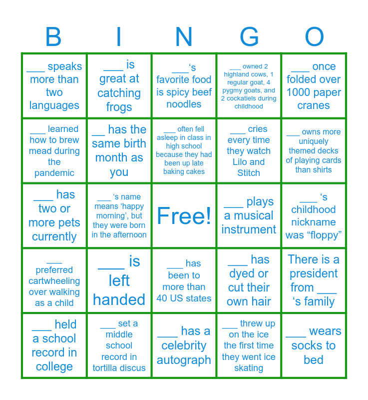 This bingo card has a free space and 24 words: ___ is left handed, ___ set a middle school record in tortilla discus, ___ often fell asleep in class in high school because they had been up late baking cakes, ___ held a school record in college, ___ once folded over 1000 paper cranes, ___ speaks more than two languages, ___ learned how to brew mead during the pandemic, ___ is great at catching frogs, ___ plays a musical instrument, ___ has been to more than 40 US states, ___ cries every time they watch Lilo and Stitch, ___ has two or more pets currently, ___ has dyed or cut their own hair, There is a president from ___ ‘s family, __ has the same birth month as you, ___ threw up on the ice the first time they went ice skating, ___ ‘s childhood nickname was “floppy”, ___‘s favorite food is spicy beef noodles, ___ owns more uniquely themed decks of playing cards than shirts, ___ ‘s name means ‘happy morning’, but they were born in the afternoon, ___ wears socks to bed, ___ preferred cartwheeling over walking as a child, ___ owned 2 highland cows, 1 regular goat, 4 pygmy goats, and 2 cockatiels during childhood and ___ has a celebrity autograph.