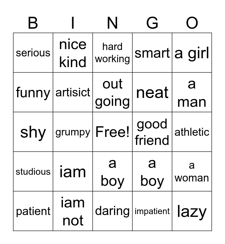 This bingo card has a free space and 24 words: iam, iam not, out going, patient, a girl, serious, funny, nice kind, good friend, a boy, neat, shy, a boy, a woman, artisict, impatient, athletic, hard working, a man, grumpy, lazy, studious, smart and daring.