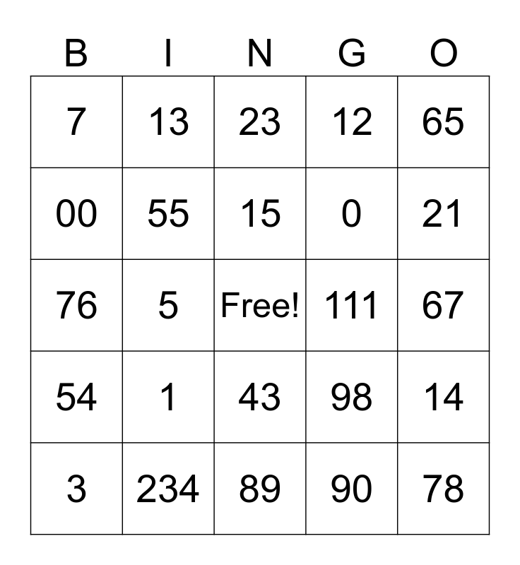This bingo card has a free space and 29 words: 3, 11, 5, 6, 7, 23, 55, 1, 111, 234, 67, 78, 89, 90, 21, 32, 43, 54, 65, 76, 98, 87, 0, 00, 12, 13, 14, 15 and 16.
