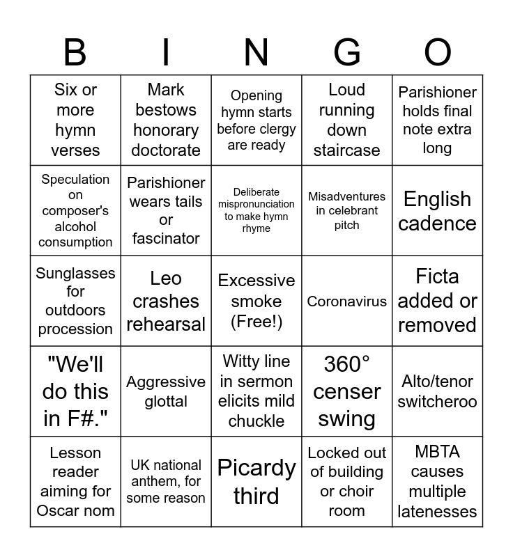 This bingo card has a free space and 24 words: Aggressive glottal, UK national anthem, for some reason, Deliberate mispronunciation to make hymn rhyme, Lesson reader aiming for Oscar nom, Parishioner holds final note extra long, Six or more hymn verses, Speculation on composer's alcohol consumption, Mark bestows honorary doctorate, Coronavirus, Witty line in sermon elicits mild chuckle, Misadventures in celebrant pitch, Sunglasses for outdoors procession, 360° censer swing, Alto/tenor switcheroo, Parishioner wears tails or fascinator, Locked out of building or choir room, Ficta added or removed, Opening hymn starts before clergy are ready, English cadence, Leo crashes rehearsal, MBTA causes multiple latenesses, "We'll do this in F#.", Loud running down staircase and Picardy third.