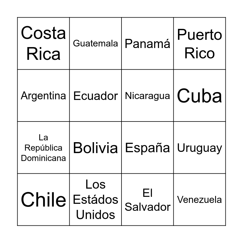 This bingo card has 21 words: Los Estádos Unidos, México, Guatemala, Honduras, El Salvador, Nicaragua, Costa Rica, Panamá, España, Cuba, La República Dominicana, Puerto Rico, Venezuela, Colombia, Ecuador, Perú, Chile, Bolivia, Argentina, Uruguay and Paraguay.