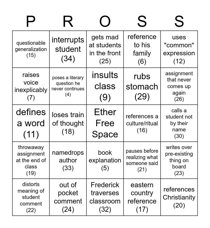 This bingo card has a free space and 35 words: tells people to "write that down" (1), anecdote from his life (2), tangent within a tangent (3), poses a literary question he never continues (4), book explanation (5), reference to his family (6), raises voice inexplicably (7), 1950's voice (8), insults class (9), tells someone to speak up (10), defines a word (11), uses "common" expression (12), reference to something nobody knows (13), does an impression (14), questionable generalization (15), references a culture/ritual (16), eastern country reference (17), loses train of thought (18), throwaway assignment at the end of class (19), references Christianity (20), pauses before realizing what someone said (21), distorts meaning of student comment (22), writes over pre-existing thing on board (23), out of pocket comment (24), gets mad at students in the front (25), assignment that never comes up again (26), says someone has been waiting patiently (27), tangent (28), rubs stomach (29), calls a student not by their name (30), student yaps (31), Frederick traverses classroom (32), namedrops author (33), interrupts student (34) and doesn't respond to student comment (35).