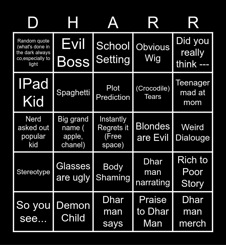 This bingo card has a free space and 29 words: So you see..., --- always said/ says, Big grand name ( apple, chanel), Evil main character, Random quote (what's done in the dark always co,especially to light, School Setting, Spaghetti, Glasses are ugly, Blondes are Evil, Demon Child, Weird Dialouge, Dhar man merch, Dhar man says, Praise to Dhar Man, Teenager mad at mom, Actual Humor, Body Shaming, Stereotype, Did you really think ---, Nerd asked out popular kid, Dhar man narrating, Flashback, (Crocodile) Tears, IPad Kid, Obvious Wig, Evil Boss, Rich to Poor Story, Plot Prediction and Unnecessary YouTuber Cameo.