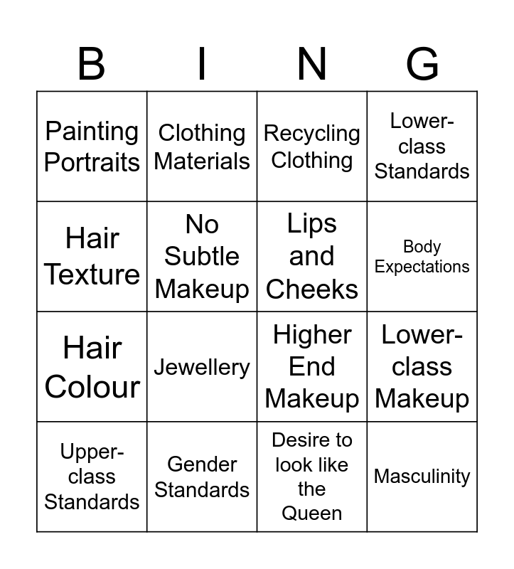 This bingo card has 24 words: Big Foreheads, Eyebrows, Body Expectations, Eye Makeup, Hair Texture, Painting Portraits, No Subtle Makeup, Clothing Materials, Gender Standards, Celebrities and Influencers, Hair Colour, Higher End Makeup, Pale, Clothing Style, Lips and Cheeks, Hair Shape, Desire to look like the Queen, Recycling Clothing, Jewellery, Lower-class Makeup, Upper-class Standards, Masculinity, Lower-class Standards and Dresses.
