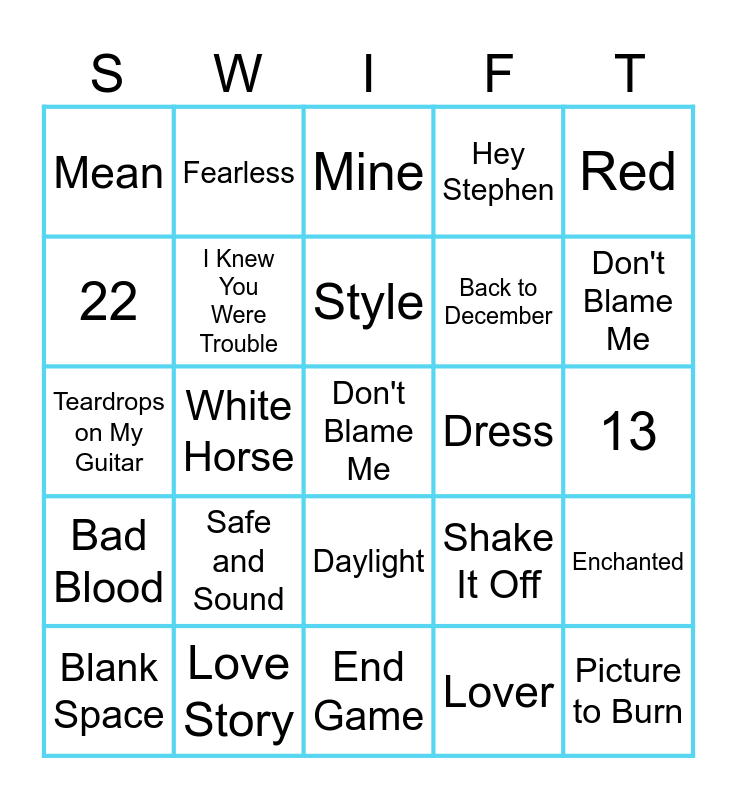 This bingo card has 40 words: You Belong with Me, White Horse, We Are Never Getting Back together, Shake It Off, Picture to Burn, Teardrops on My Guitar, I Knew You Were Trouble, 22, Back to December, Enchanted, Mean, Fearless, Don't Blame Me, Lover, 13, 22, Cardigan, Mine, Out of the Woods, Red, Bad Blood, Love Story, Style, Dress, Fifteen, Never Grow Up, Welcome to New York, Willow, Tim McGraw, Only the Young, It's Nice to Have a Friend, Safe and Sound, Daylight, Clean, Don't Blame Me, Blank Space, Anti-Hero, End Game, Hey Stephen and Mean.