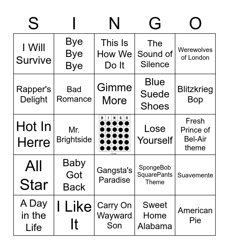 This bingo card has a free space and 39 words: Bohemian Rhapsody, I Write Sins Not Tragedy, Total Eclipse of the Heart, Bad Romance, A Day in the Life, Gangsta's Paradise, Gimme More, Welcome to the Black Parade, Werewolves of London, All Star, Mr. Brightside, The Sound of Silence, American Pie, Fresh Prince of Bel-Air theme, Lose Yourself, Baby Got Back, Let's Go Crazy, I Will Survive, Don't Stop Me Now, SpongeBob SquarePants Theme, Rapper's Delight, Carry On Wayward Son, Blue Suede Shoes, Blitzkrieg Bop, Stayin' Alive, Don't Stop Believin', Levitating, Straight Outta Compton, Truth Hurts, Bye Bye Bye, Shake It Off, Wannabe, This Is How We Do It, I Like It, Sweet Home Alabama, Pony, Suavemente, Hot In Herre and September.