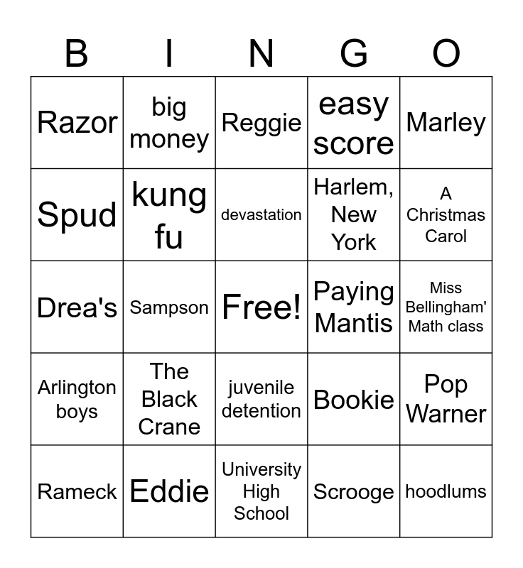 This bingo card has a free space and 29 words: Rameck, George, Sampson, Dayton Street Projects, Razor, Reggie, kung fu, The Black Crane, Paying Mantis, Eddie, Miss Bellingham' Math class, hoodlums, University High School, Scrooge, A Christmas Carol, Plainfield Elementary, juvenile detention, Arlington boys, Marley, Drea's, Bookie, Hock, Harlem, New York, Spud, easy score, big money, Pop Warner, devastation and destruction.