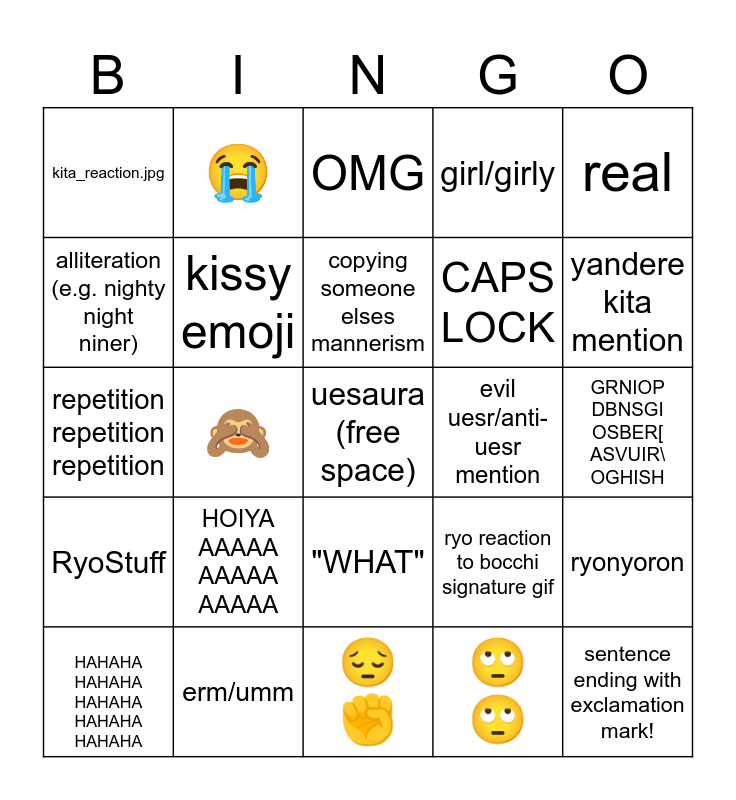 This bingo card has a free space and 29 words: HAHAHA HAHAHA HAHAHA HAHAHA HAHAHA, NAURRR, 🙈, what the creak, kita_reaction.jpg, OMG, kissy emoji, HOIYA AAAAA AAAAA AAAAA, evil uesr/anti-uesr mention, erm/umm, GRNIOP DBNSGI OSBER[ ASVUIR\ OGHISH, sentence ending with exclamation mark!, 😔✊, 🙄 🙄, yandere kita mention, uesrspeak, "WHAT", RyoStuff, real, repetition repetition repetition, ryo reaction to bocchi signature gif, nuh uh, CAPS LOCK, alliteration (e.g. nighty night niner), girl/girly, 😭, ryonyoron, copying someone elses mannerism and SAMEHAT.