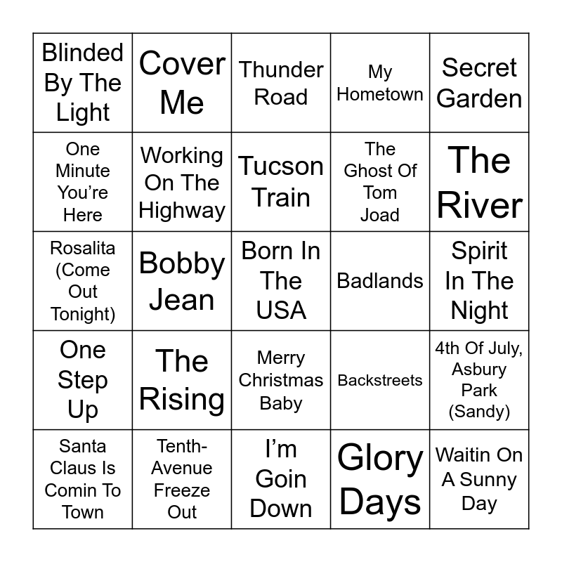 This bingo card has 45 words: Dancing In The Dark, Born In The USA, I’m On Fire, Santa Claus Is Comin To Town, Born To Run, Glory Days, Thunder Road, Hungry Heart, Secret Garden, Tenth-Avenue Freeze Out, My Hometown, Badlands, Merry Christmas Baby, The Rising, Streets Of Philadelphia, I’m Goin Down, Brilliant Disguise, Rosalita (Come Out Tonight), Atlantic City, The River, Cover Me, Tunnel Of Love, Jungle Land, Blinded By The Light, No Surrender, Spirit In The Night, Prove It All Night, Letter To You, Backstreets, One Step Up, Downbound Train, 4th Of July, Asbury Park (Sandy), Pink Cadillac, Human Touch, Darlington County, Bobby Jean, Ghosts, She’s The One, Waitin On A Sunny Day, Tucson Train, One Minute You’re Here, The Ghost Of Tom Joad, Out In The Street, Working On The Highway and The Promised Land.