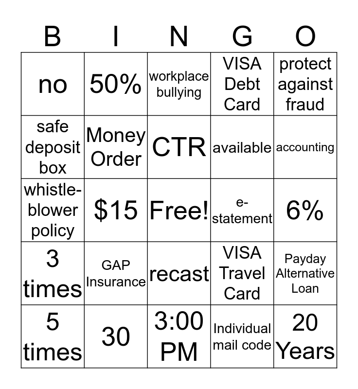 This bingo card has a free space and 47 words: Skip a Pay, 20 Years, $28, 3:00 PM, GAP Insurance, 55, 50%, 18 and 24 month, safe deposit box, $15,000, Money Order, VISA Debt Card, Payday Alternative Loan, VISA Travel Card, 70.5, 6 Month, CTR, e-statement, Bill Pay, protect against fraud, $15, Individual mail code, no, available, 14 days, accounting, 5 times, Everyone, recast, 3 times, Apple Pay, Live Chat, debit holds, 12, $5.00, 30, 6%, 2 times annual salary, true, Yes, 8 hours, workplace bullying, whistle-blower policy, $100 dollars, Ethics, false and business purpose.
