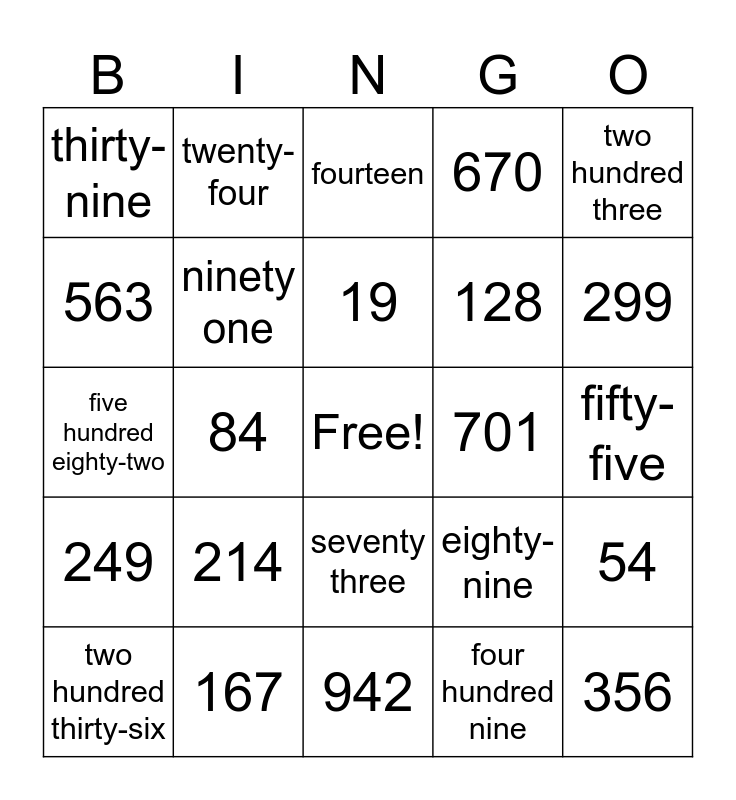 This bingo card has a free space and 27 words: eighty-nine, 76, 128, 942, 563, fourteen, twenty-four, 249, 701, 54, five hundred eighty-two, 670, two hundred thirty-six, 167, 299, 345, ninety one, 19, 214, thirty-nine, fifty-five, four hundred nine, 84, 356, seventy three, two hundred three and 166.