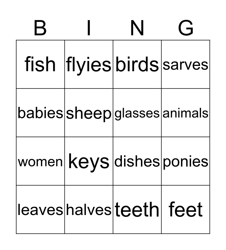 This bingo card has a free space and 15 words: leaves, feet, birds, fish, animals, babies, keys, teeth, sheep, women, ponies, sarves, glasses, flyies and halves.
