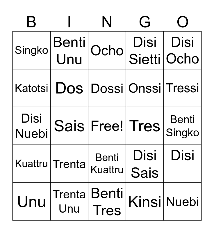 This bingo card has a free space and 29 words: Unu, Benti, Sais, Benti Sietti, Singko, Ocho, Dos, Trenta, Tres, Trenta Unu, Benti Singko, Nuebi, Benti Tres, Kinsi, Tressi, Dies, Benti Kuattru, Kuattru, Disi Ocho, Disi Nuebi, Disi Sais, Sietti, Onssi, Katotsi, Disi Sietti, Benti Unu, Disi, Dossi and Tressi.