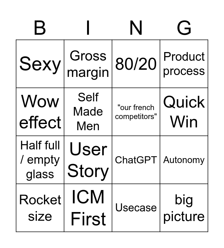 This bingo card has 16 words: ICM First, Autonomy, 80/20, Sexy, Half full / empty glass, Gross margin, ChatGPT, Usecase, Wow effect, Self Made Men, Rocket size, Product process, User Story, Quick Win, "our french competitors" and big picture.