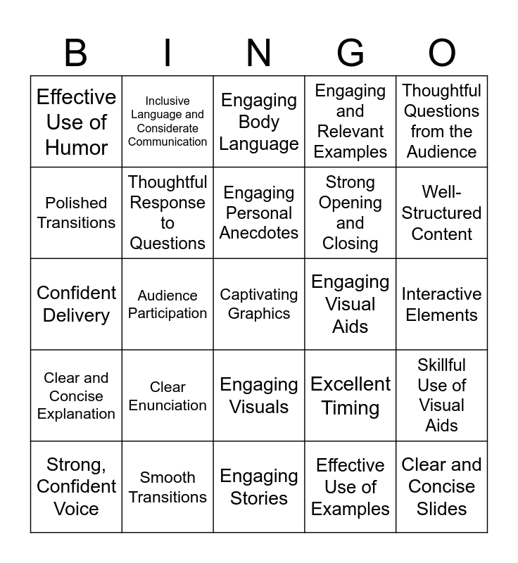 This bingo card has 29 words: Strong, Confident Voice, Well-Prepared Speaker, Audience Participation, Clear and Concise Slides, Effective Use of Humor, Engaging Body Language, Thoughtful Response to Questions, Clear Enunciation, Engaging Visual Aids, Smooth Transitions, Interactive Elements, Captivating Graphics, Engaging Stories, Effective Use of Examples, Well-Structured Content, Enthusiastic Presenter, Engaging Visuals, Clear and Concise Explanation, Thoughtful Questions from the Audience, Confident Delivery, Excellent Timing, Engaged Audience, Strong Opening and Closing, Polished Transitions, Engaging and Relevant Examples, Inclusive Language and Considerate Communication, Skillful Use of Visual Aids, Engaging Personal Anecdotes and Encouraging and Supportive Audience Reactions.