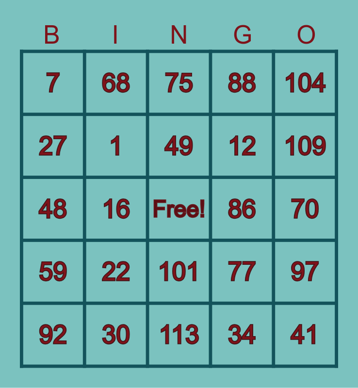 This bingo card has a free space and 24 words: 22, 30, 49, 92, 104, 7, 27, 68, 86, 101, 12, 48, 77, 97, 1, 34, 70, 75, 109, 16, 41, 59, 88 and 113.