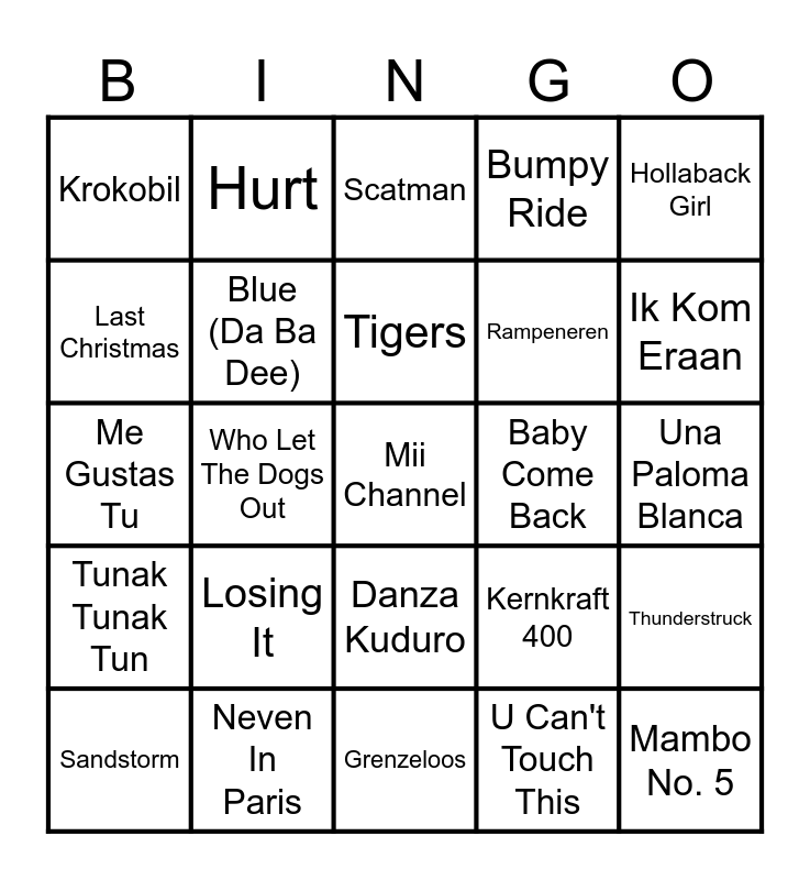 This bingo card has a free space and 24 words: Losing It, Neven In Paris, Tigers, Sandstorm, Hollaback Girl, Krokobil, Last Christmas, Hurt, Baby Come Back, Danza Kuduro, Rampeneren, Me Gustas Tu, Kernkraft 400, Thunderstruck, Blue (Da Ba Dee), U Can't Touch This, Una Paloma Blanca, Scatman, Ik Kom Eraan, Who Let The Dogs Out, Mambo No. 5, Tunak Tunak Tun, Bumpy Ride and Grenzeloos.