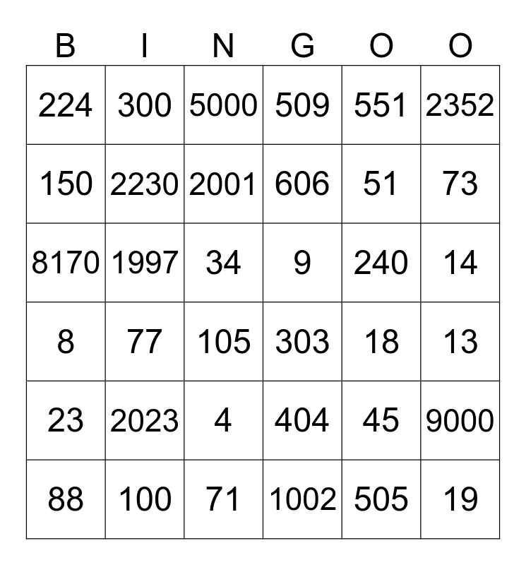 This bingo card has 42 words: 505, 2230, 89, 240, 13, 77, 8170, 99, 5000, 14, 34, 606, 73, 551, 100, 8, 9000, 51, 19, 300, 2352, 4, 23, 224, 12, 88, 2001, 450, 2023, 45, 250, 9, 150, 18, 71, 105, 303, 1997, 404, 1002, 509 and 21.