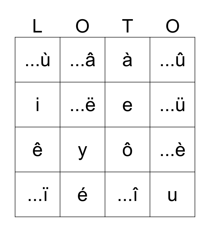 This bingo card has 16 words: é, ...è, à, ...ù, ê, ...â, ô, ...î, i, ...ë, ...ï, ...û, y, ...ü, e and u.