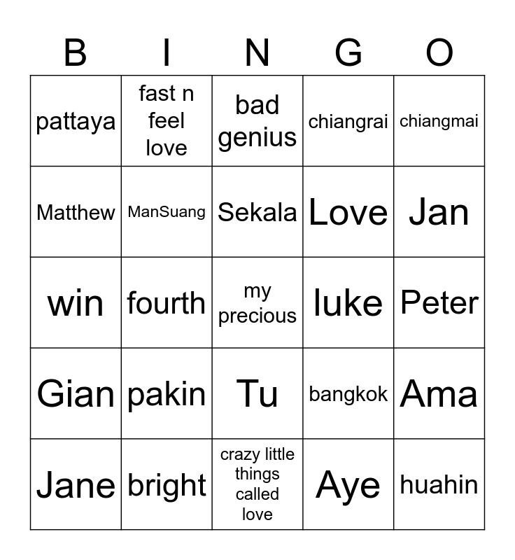 This bingo card has 25 words: pakin, crazy little things called love, Sekala, Jane, chiangmai, pattaya, Matthew, fast n feel love, luke, Tu, Love, win, bangkok, Ama, ManSuang, huahin, Peter, bad genius, Jan, fourth, my precious, bright, Gian, chiangrai and Aye.