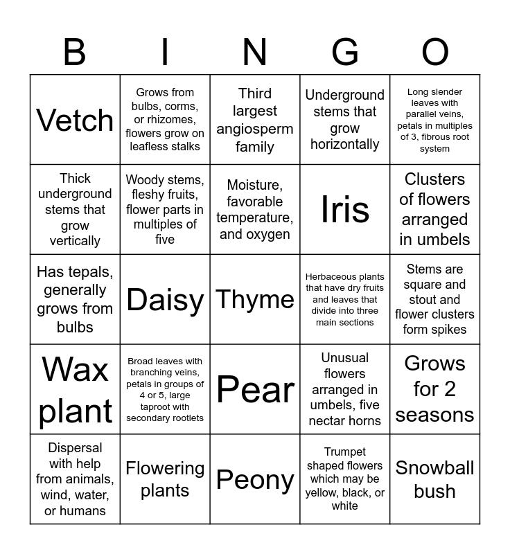 This bingo card has 30 words: Flowering plants, Nonflowering plants, Daisy, Made up of both ray and disk flowers, Vetch, Third largest angiosperm family, Woody stems, fleshy fruits, flower parts in multiples of five, Pear, Herbaceous plants that have dry fruits and leaves that divide into three main sections, Peony, Stems are square and stout and flower clusters form spikes, Thyme, Trumpet shaped flowers which may be yellow, black, or white, Snowball bush, Clusters of flowers arranged in umbels, Dill, Unusual flowers arranged in umbels, five nectar horns, Wax plant, Broad leaves with branching veins, petals in groups of 4 or 5, large taproot with secondary rootlets, Long slender leaves with parallel veins, petals in multiples of 3, fibrous root system, Has tepals, generally grows from bulbs, Tulip, Grows from bulbs, corms, or rhizomes, flowers grow on leafless stalks, Iris, Thick underground stems that grow vertically, Underground stems that grow horizontally, Grows for 2 seasons, Dispersal with help from animals, wind, water, or humans, Moisture, favorable temperature, and oxygen and Structures designed for for absorption and storage.