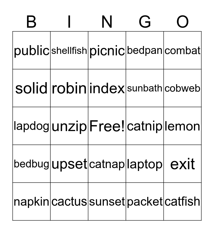 This bingo card has a free space and 24 words: upset, cactus, index, napkin, combat, public, solid, shellfish, catnip, catnap, sunbath, lapdog, laptop, exit, robin, packet, lemon, picnic, cobweb, unzip, catfish, bedbug, bedpan and sunset.