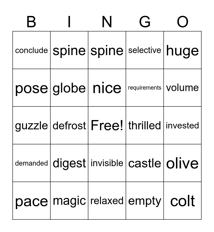 This bingo card has a free space and 24 words: digest, magic, nice, pace, huge, conclude, pose, spine, thrilled, invisible, requirements, guzzle, castle, olive, globe, empty, invested, spine, volume, defrost, colt, demanded, selective and relaxed.