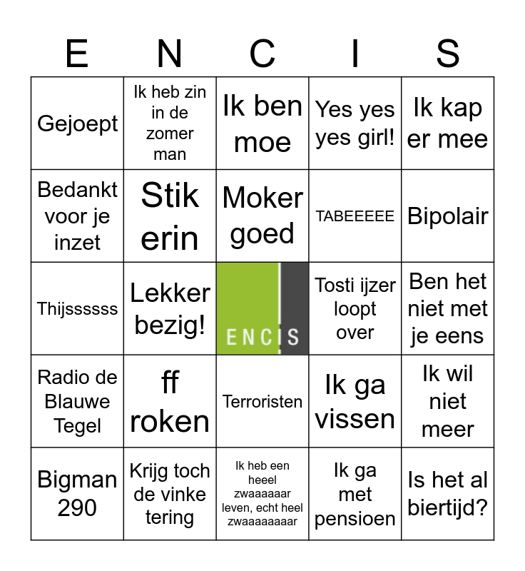 This bingo card has a free space and 40 words: Ik ben er klaar mee, Thijssssss, Etteren, Stik erin, Krijg toch de vinke tering, Terroristen, Moker goed, Buddy, Ik kap er mee, Radio de Blauwe Tegel, Lekker bezig!, Yes yes yes girl!, Is het al biertijd?, Ben het niet met je eens, Tosti ijzer loopt over, ff roken, Baby shark, Gejoept, Het waait hieeeeerr, Ik ben moe, Ik wil niet meer, Ik ga met pensioen, TABEEEEE, Bedankt voor je inzet, Tjuuuuuus, Ik heb zin in een appel, Ik ga thuis werken, Chagrijning, Tragi ziekte, Doegies, Wat vreeeeselijk, Bigman 290, Nicolaaaaaaaas, Ik ga vissen, Bipolair, Ik heb een heeel zwaaaaaar leven, echt heel zwaaaaaaaar, Is het al 5 uur?, Wat gaan we doen met eten?, Ik heb zin in de zomer man and Mooi bureaublad.
