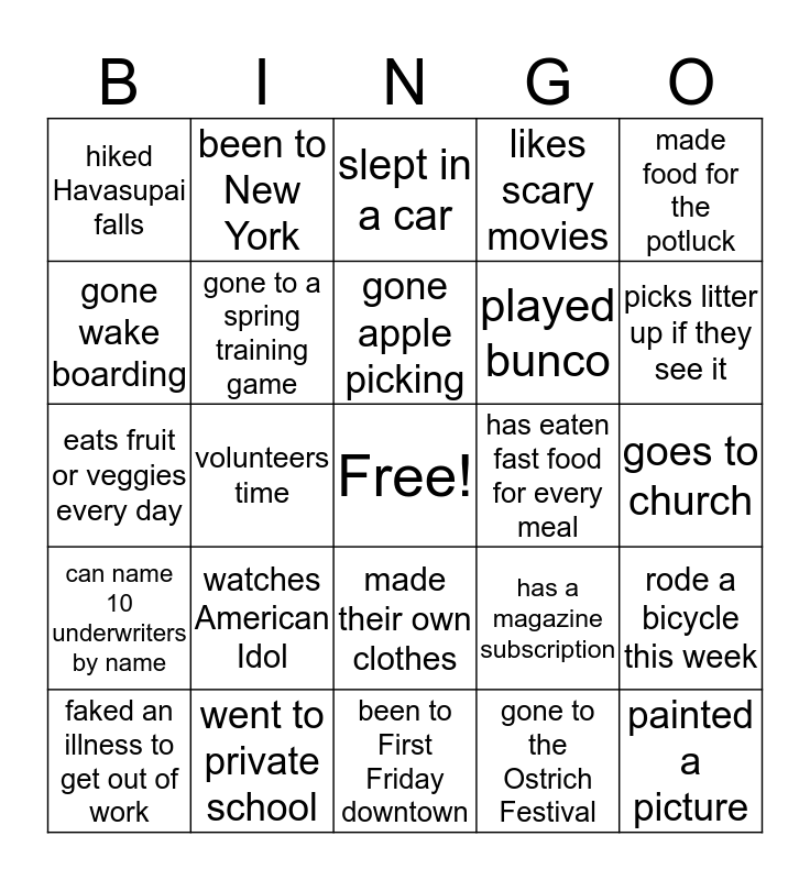 This bingo card has a free space and 24 words: watches American Idol, went to private school, gone apple picking, faked an illness to get out of work, made food for the potluck, hiked Havasupai falls, gone wake boarding, been to New York, has eaten fast food for every meal, made their own clothes, played bunco, eats fruit or veggies every day, has a magazine subscription, rode a bicycle this week, gone to a spring training game, gone to the Ostrich Festival, goes to church, slept in a car, picks litter up if they see it, volunteers time, painted a picture, can name 10 underwriters by name, likes scary movies and been to First Friday downtown.