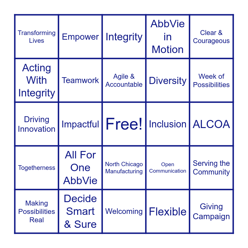 This bingo card has a free space and 24 words: All For One AbbVie, Decide Smart & Sure, Agile & Accountable, Making Possibilities Real, Clear & Courageous, Transforming Lives, Acting With Integrity, Empower, Inclusion, North Chicago Manufacturing, Diversity, Driving Innovation, Open Communication, Serving the Community, Teamwork, Flexible, ALCOA, Integrity, Week of Possibilities, Impactful, Giving Campaign, Togetherness, AbbVie in Motion and Welcoming.