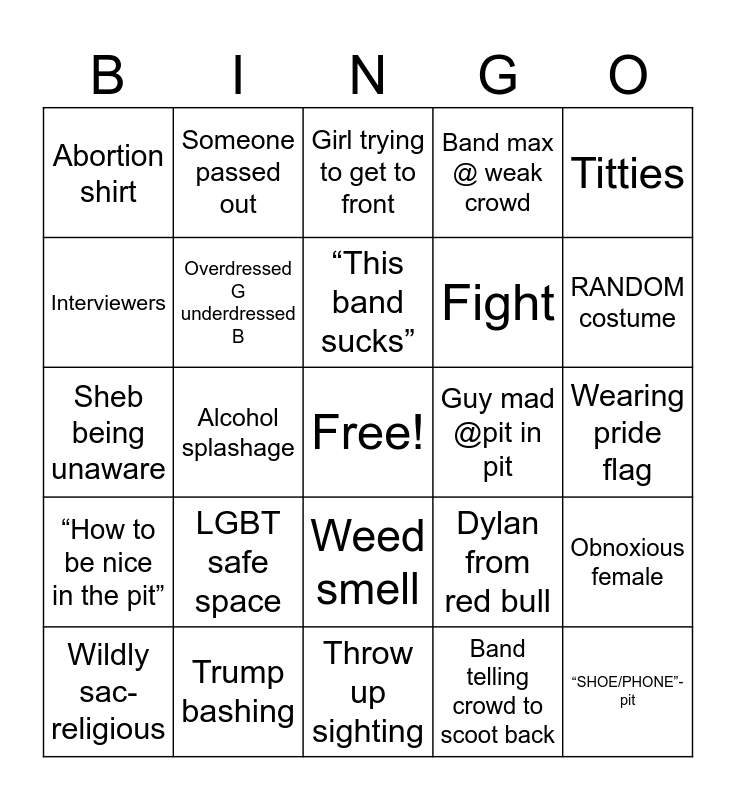 This bingo card has a free space and 24 words: LGBT safe space, Trump bashing, “This band sucks”, Wildly sac-religious, Titties, Abortion shirt, Interviewers, Someone passed out, Guy mad @pit in pit, Weed smell, Fight, Sheb being unaware, Dylan from red bull, Obnoxious female, Overdressed G underdressed B, Band telling crowd to scoot back, Wearing pride flag, Girl trying to get to front, RANDOM costume, Alcohol splashage, “SHOE/PHONE”- pit, “How to be nice in the pit”, Band max @ weak crowd and Throw up sighting.
