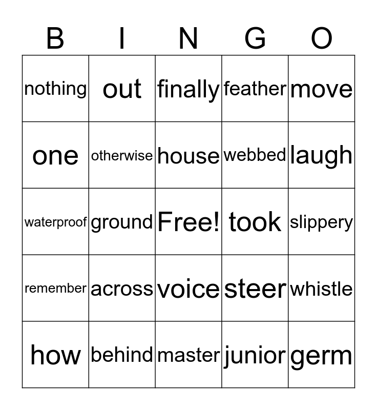 This bingo card has a free space and 24 words: across, behind, house, how, move, nothing, one, out, took, voice, webbed, waterproof, steer, whistle, otherwise, junior, slippery, finally, laugh, ground, germ, remember, feather and master.