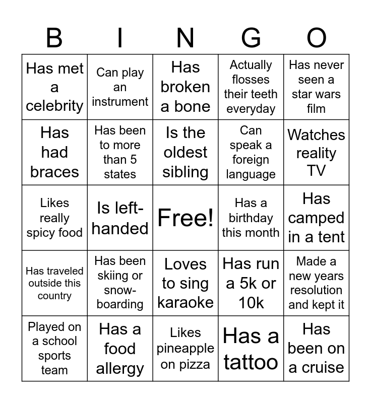 This bingo card has a free space and 24 words: Has been skiing or snow-boarding, Has a food allergy, Is the oldest sibling, Played on a school sports team, Has never seen a star wars film, Has met a celebrity, Has had braces, Can play an instrument, Has a birthday this month, Loves to sing karaoke, Can speak a foreign language, Likes really spicy food, Has run a 5k or 10k, Made a new years resolution and kept it, Has been to more than 5 states, Has a tattoo, Has camped in a tent, Has broken a bone, Watches reality TV, Is left- handed, Has been on a cruise, Has traveled outside this country, Actually flosses their teeth everyday and Likes pineapple on pizza.